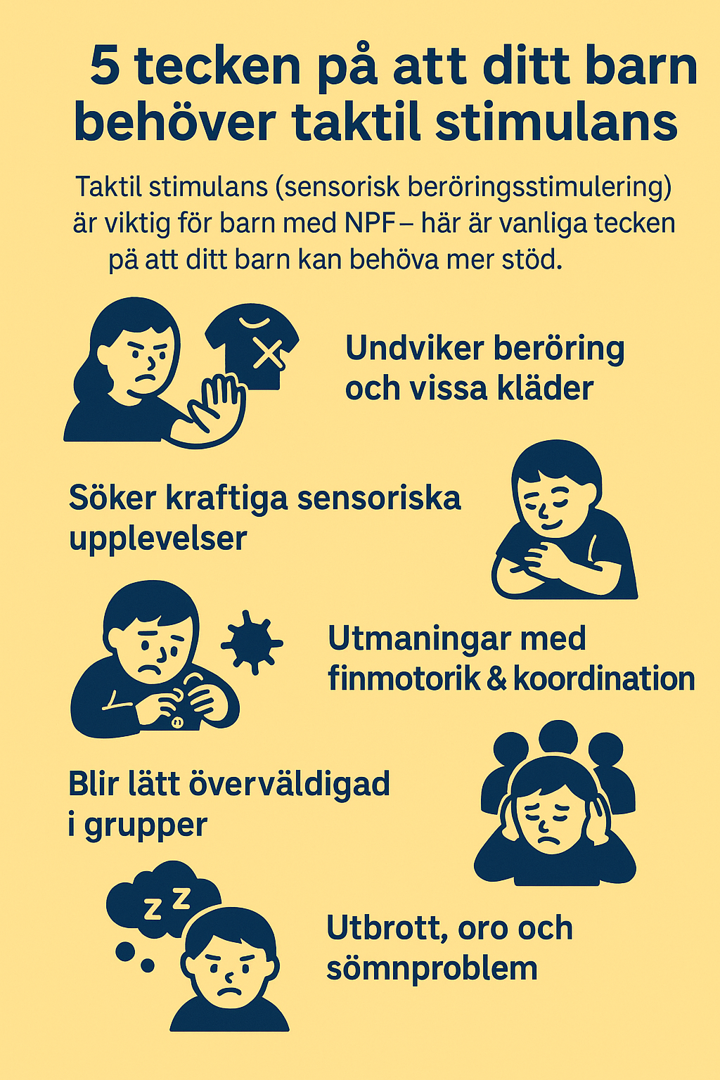 Taktil stimulans (sensorisk beröringsstimulering) är viktig för barns utveckling och trygghet. För barn med NPF – som autism, ADHD eller sensorisk känslighet – kan det taktila systemet fungera annorlunda. Det kan leda till att barnet antingen undviker beröring eller ständigt söker tryck och kontakt.